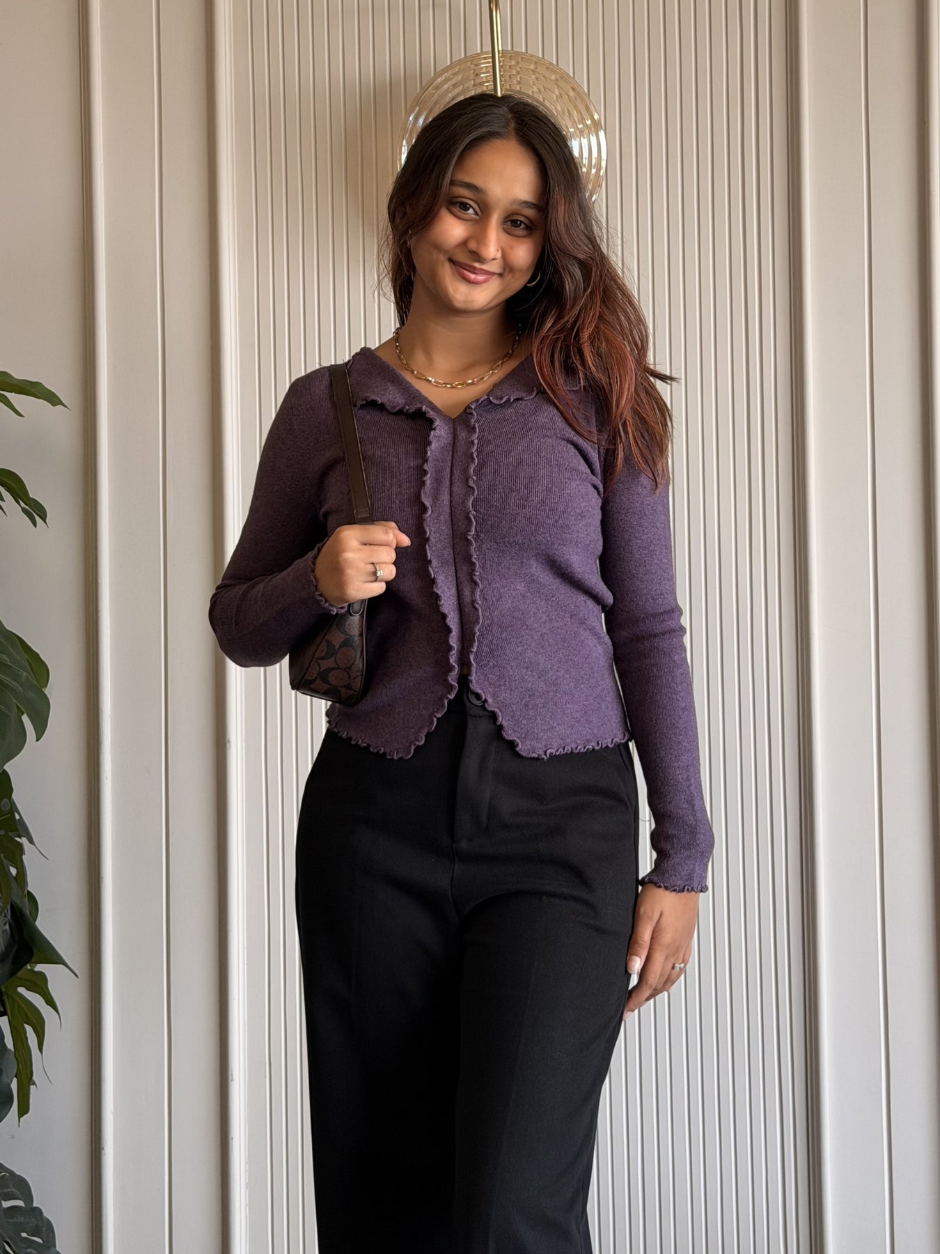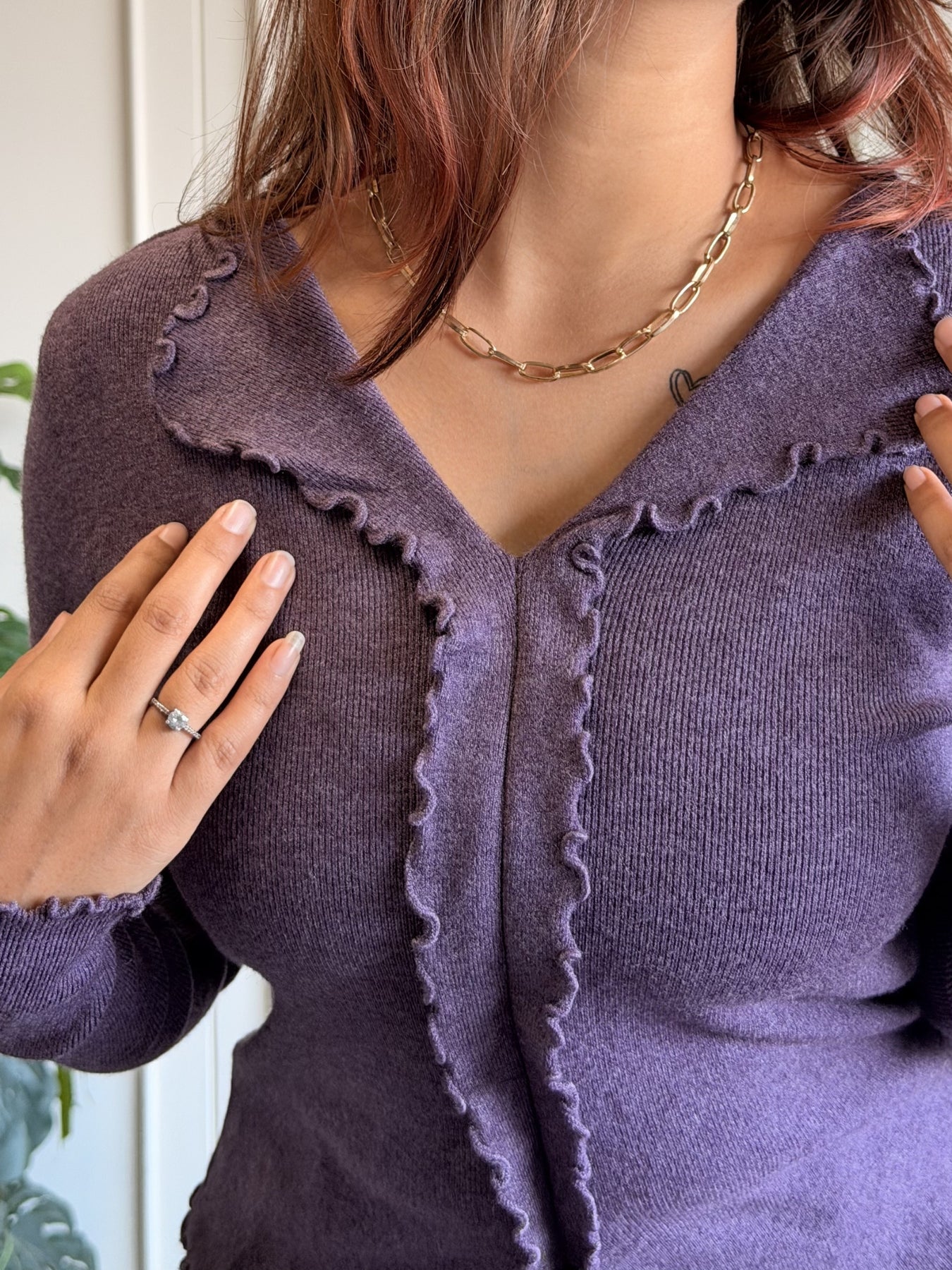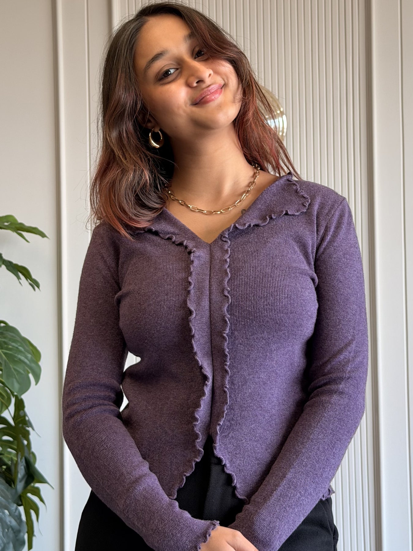 This elegant Contour Lettuce Edge Top combines soft comfort with feminine detailing for an effortlessly refined look. Crafted from a lightweight, stretchable ribbed fabric, it features a flattering V-neckline with delicate lettuce-edge trims that add subtle texture and charm. The front open-style design creates a modern layered effect, while the fitted silhouette enhances your natural shape. Perfect for both casual outings and dressed-up moments, this versatile top pairs seamlessly with trousers, skirts, or denim.