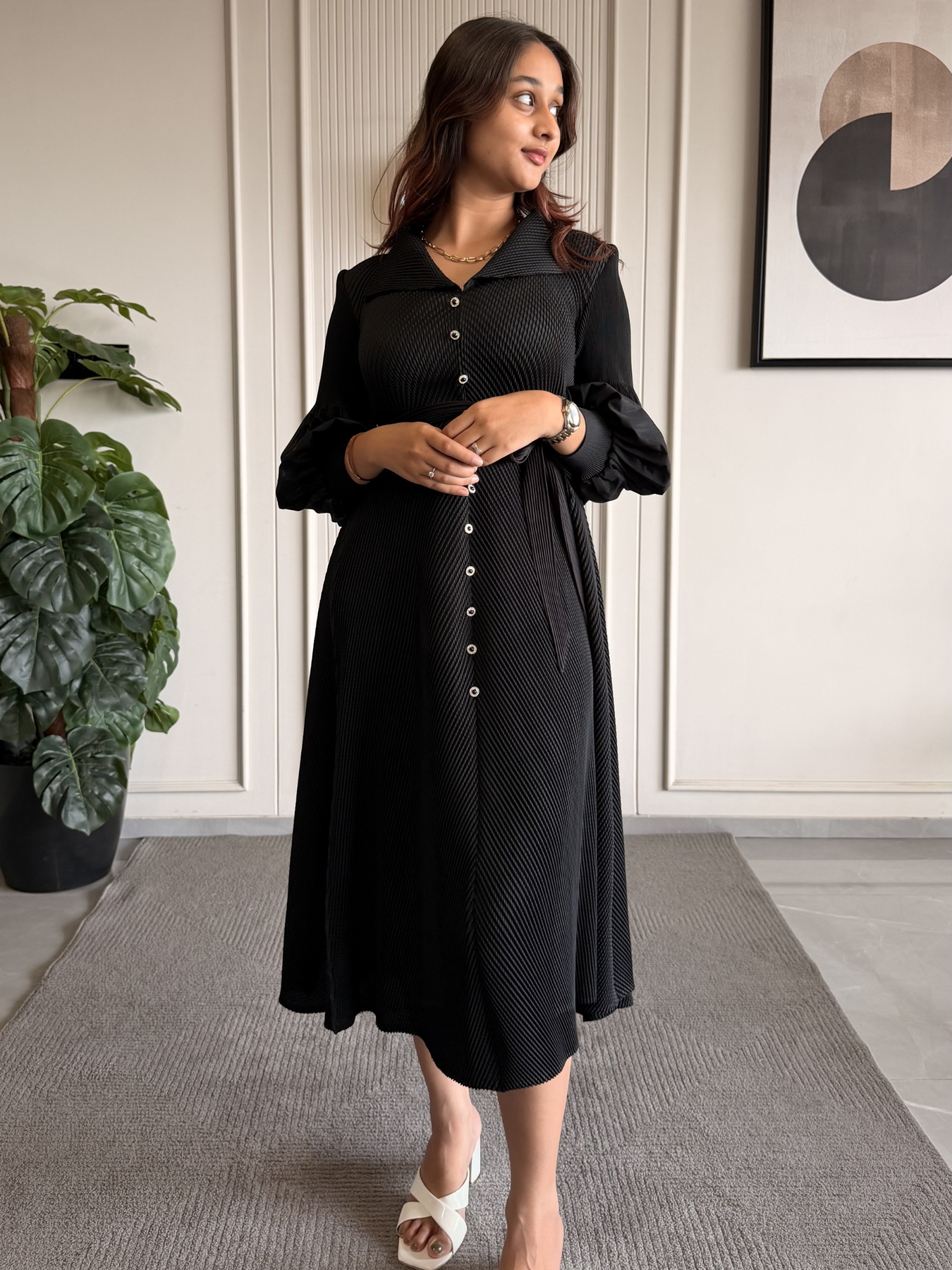 This elegant Belted Flow Midi Dress blends timeless sophistication with effortless comfort. Crafted from a lightweight, breathable bamboo fabric, it features a flattering collared neckline with a front button-down design for a refined touch. The flowy midi silhouette paired with a detachable waist belt cinches beautifully to enhance your shape, while the soft gathered sleeves add a subtle feminine charm. Designed for versatility, this dress is available in multiple colors, making it perfect for both everyday wear and elevated occasions.