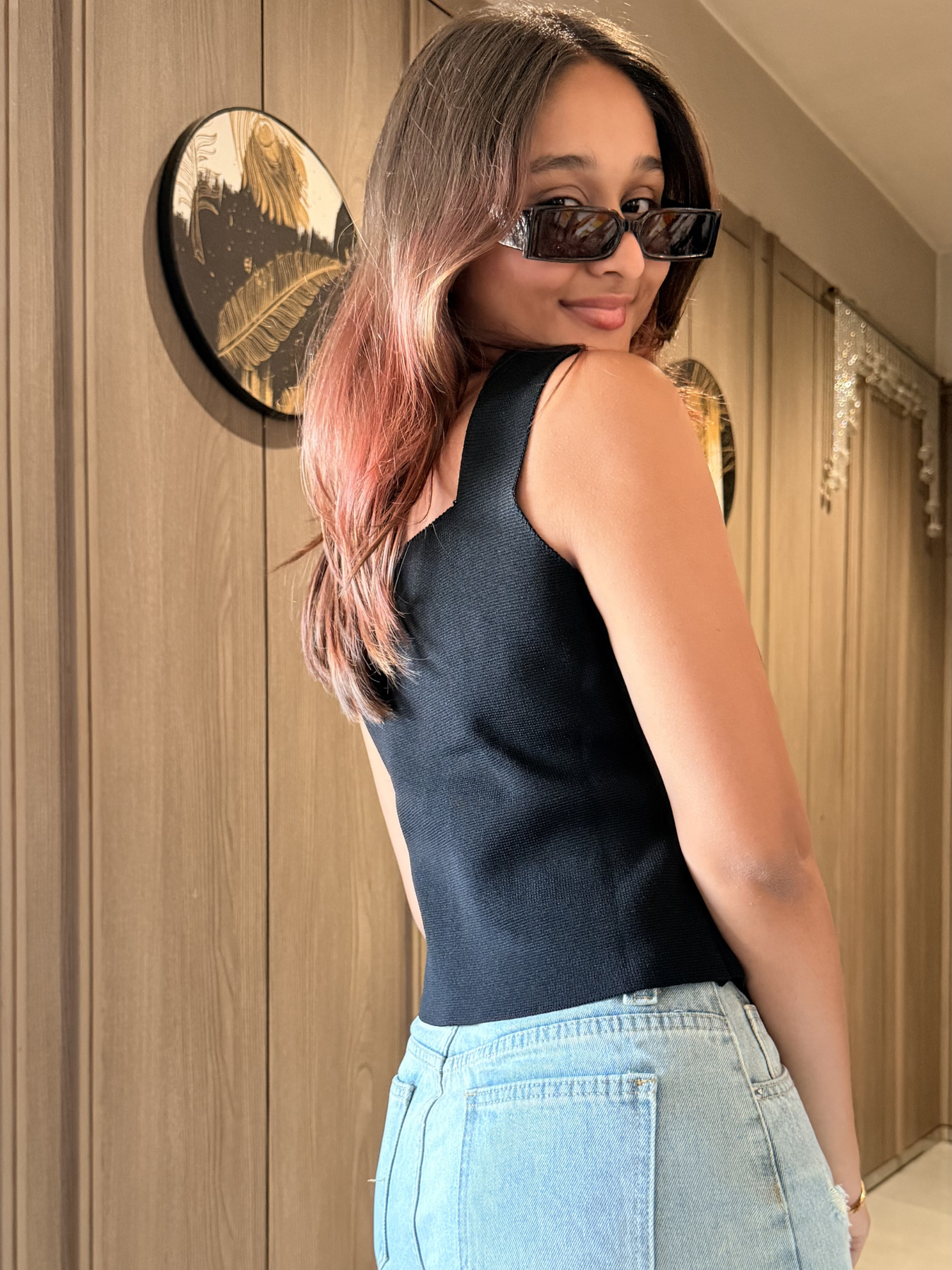 This chic knit waistcoat top blends structured tailoring with modern minimalism. Crafted from a soft, textured knit fabric, it features a flattering square neckline and a sleeveless silhouette. The front is accented with a row of elegant gold-tone buttons, while the asymmetrical hem adds a contemporary edge. Designed to be worn as a statement piece or layered effortlessly, this versatile top pairs beautifully with denim, trousers, or skirts for both casual and elevated looks.